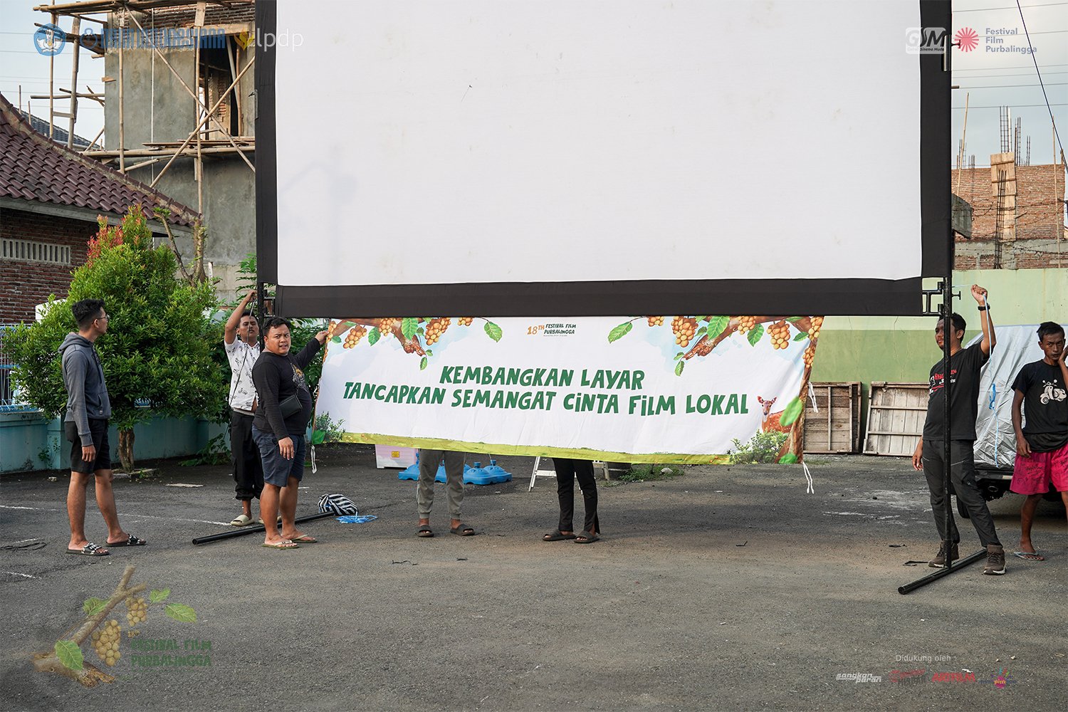 Dibawah terik matahari sore, para Laskar Layar Tanjleb yang digawangi pemuda kelurahan se-Kecamatan Purwokerto Timur, Banyumas yang tergabung dalam Karang Taruna Bhakti Mahardika mempersiapkan sound system, layar, hingga menggelar terpal di pelataran Balai Kelurahan Purwokerto Wetan pada Minggu, 7 Juli 2024.